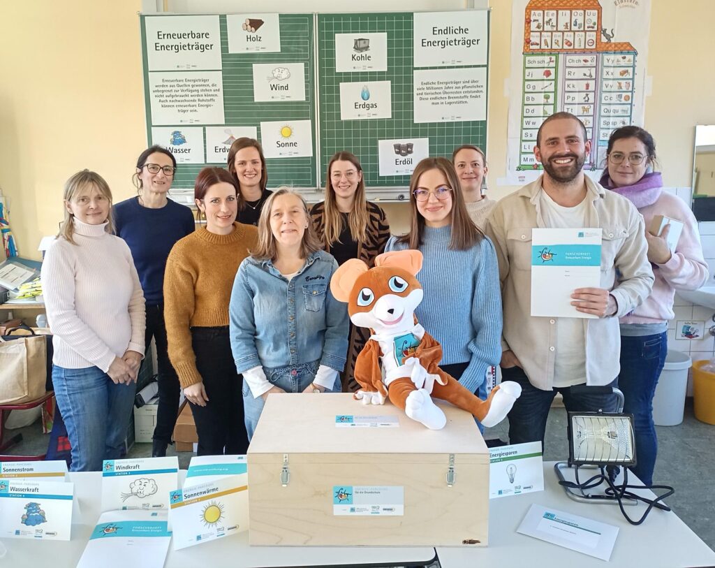 Zur Lieferung, Energiewende gerecht mit einem batterie-elektrischen Fahrzeug, gehörte auch eine Einführung für das Kollegium durch die VRD Stiftung: Nach einer Beschreibung von Lehrerhandreichung, Forscherheft und Experimenten mit fünf Stationen zu den Themen Sonnenstrom, Sonnenwärme, Windkraft, Wasserkraft und Energiesparen konnten die Lehrkräfte anschließend selbst experimentieren und sich dabei in die Rolle ihrer Schüler/innen versetzen.